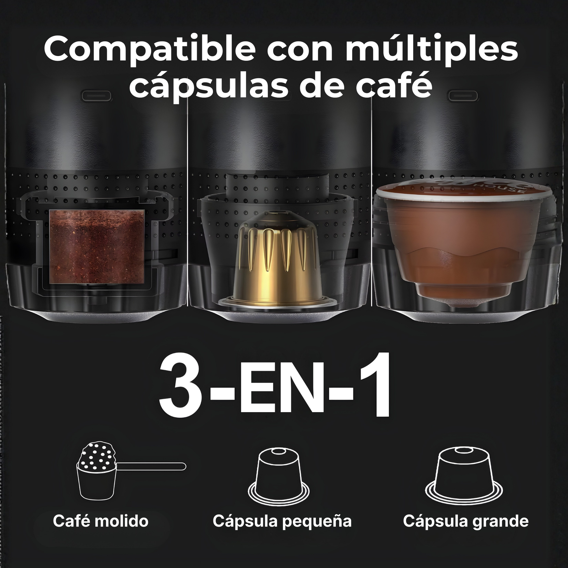 - 🔄 Compatibilidad 3 en 1: funciona con café molido y cápsulas pequeñas y grandes.
