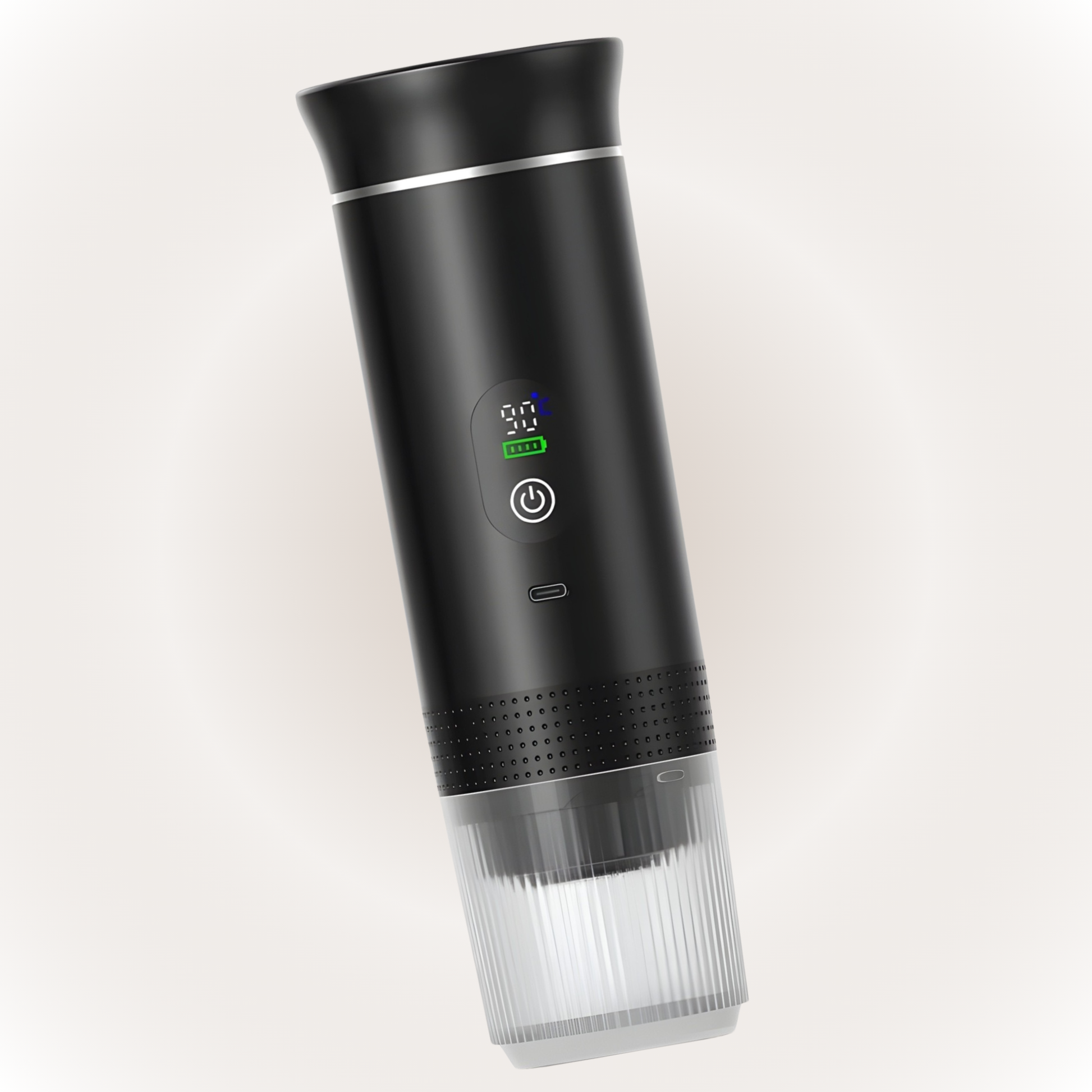 Su diseño compacto y recargable permite disfrutar de café recién hecho sin enchufes ni máquinas voluminosas.